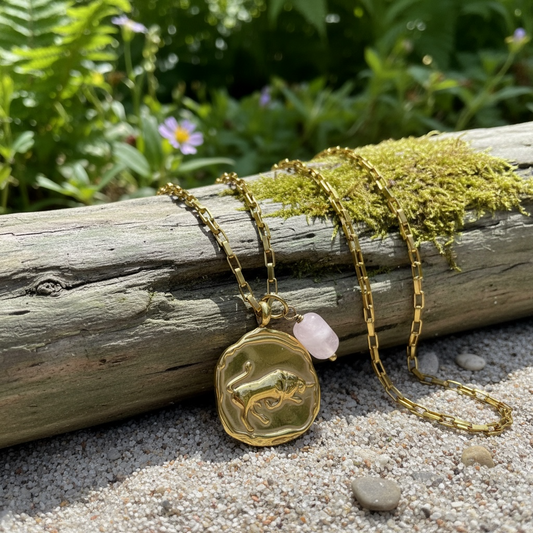 Sternzeichenkette Stier mit Rosenquarz – 18K vergoldeter Edelstahl