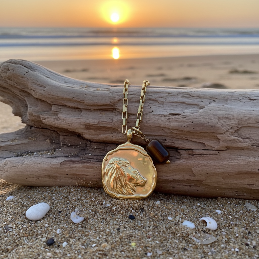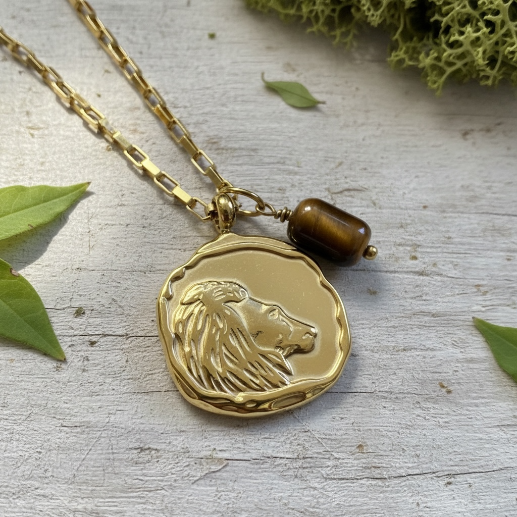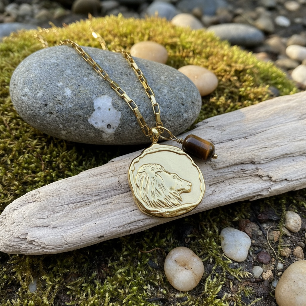 Der warm schimmernde Anhänger aus Tigerauge ergänzt das Design mit seiner lebendigen, goldbraunen Maserung. In der Edelsteinkunde wird Tigerauge symbolisch mit innerer Stärke, Entschlossenheit, Fokus und kraftvoller Erdung verbunden. Seine dynamische Ausstrahlung passt perfekt zur feurigen, selbstbewussten Natur des Löwen.