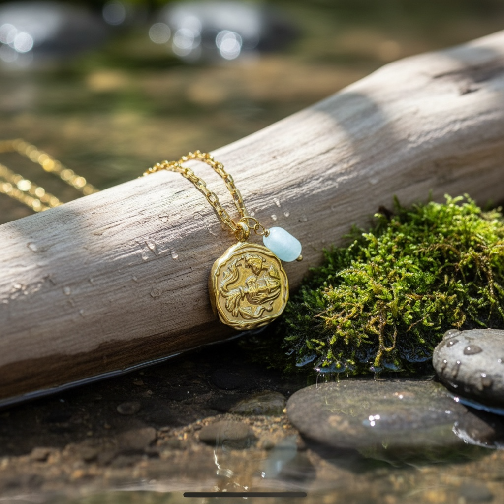 Das aus Edelstahl gefertigte, 18K vergoldete Medaillon zeigt das Wassermann-Symbol in einer organisch inspirierten Form – ein Sinnbild für Freiheit, Individualität, Kreativität und innovatives Denken, die traditionell mit dem Sternzeichen Wassermann verbunden werden.