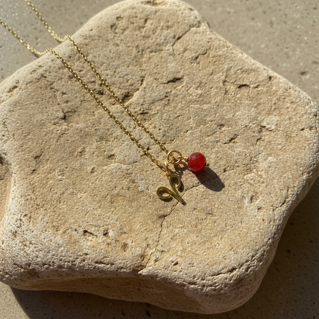 Diese feine Sternzeichenkette verbindet die kraftvolle Symbolik des Widders mit der warmen Ausstrahlung des Karneols. Das zart gearbeitete Widder-Symbol aus 18K vergoldetem Edelstahl (ca. 1 cm) fügt sich harmonisch in das filigrane Kettendesign ein und steht symbolisch für Mut, Tatkraft und innere Stärke, die traditionell mit dem Sternzeichen Widder verbunden werden.