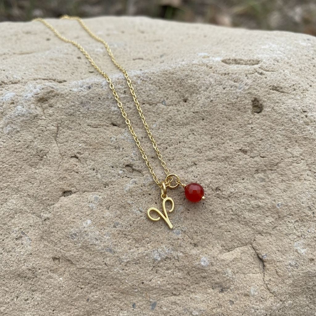 Der facettierte Karneol-Anhänger setzt einen dezenten, warmen Farbakzent. In der Edelsteinkunde wird Karneol symbolisch mit Lebensfreude, Leidenschaft und kreativer Energie assoziiert – eine sanfte Ergänzung zur feurigen Widder-Natur, interpretiert in einem eleganten, alltagstauglichen Stil.
